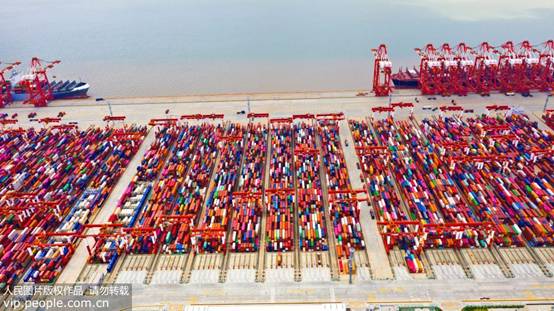 2019年8月25日,航拍橋吊林立,集裝箱堆放整齊的上海洋山深水港區(qū)。金漢昕攝(人民圖片)