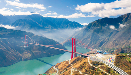 從四川盆地向青藏高原急速攀升的過渡地帶,延綿不絕的橫斷山脈直聳云天,奔騰的大江大河蜿蜒阻隔。以前修路,只有靠無盡的繞行來翻山越嶺。今天,筑路者正在用科技手段讓天塹變通途。川藏線上,類似克枯大橋這樣的超級(jí)工程越來越多。