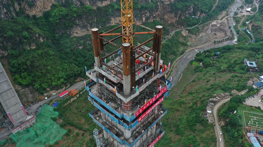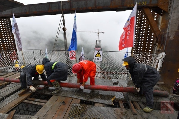 四川鐵投四川路橋金陽河特大橋項(xiàng)目部工程科科長俞坤升介紹,針對大橋建設(shè)難點(diǎn),項(xiàng)目部自行研發(fā)多項(xiàng)“黑科技”,力克安全風(fēng)險(xiǎn)和技術(shù)難關(guān)。比如,項(xiàng)目研發(fā)的自爬式多功能提升系統(tǒng),可實(shí)現(xiàn)鋼管安裝、C80澆筑、外包及隔板施工同步作業(yè),節(jié)約工期3個月,并將重達(dá)45噸的鋼管輕松吊到墩頂。