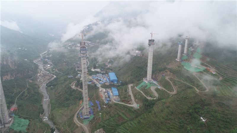 記者在現(xiàn)場看到,金陽河峽谷類似一個深“V”字。峽谷中,幾根高聳入云端的橋墩額外醒目。峽谷的兩邊分別是金陽縣的新舊縣城。正在進行封頂工作的金陽河特大橋6號主墩高196米,相當于65層樓高,是目前同類橋型的世界第一高墩。