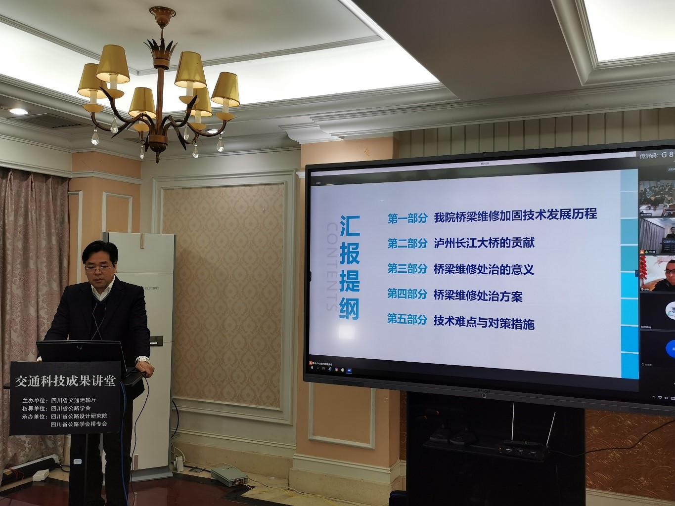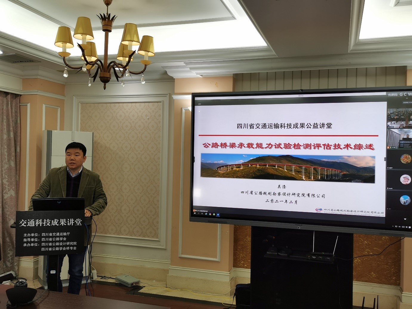 2月20日,由四川省交通運(yùn)輸廳主辦、四川省公路學(xué)會(huì)協(xié)辦,公司和四川省公路學(xué)會(huì)橋梁專業(yè)委員會(huì)共同承辦的四川省交通運(yùn)輸科技成果講堂(川交科成果-005)公益直播專題系列講堂第五期在公司成功舉辦。會(huì)議采用線上直播和現(xiàn)場(chǎng)會(huì)議方式進(jìn)行,本次交通運(yùn)輸科技成果講堂經(jīng)多平臺(tái)轉(zhuǎn)播,共吸引了高速公路養(yǎng)護(hù)公司、地市州公路局、交通局等業(yè)主單位,以及橋梁設(shè)計(jì)、科研、施工、監(jiān)理、檢測(cè)等單位近2000人參加。