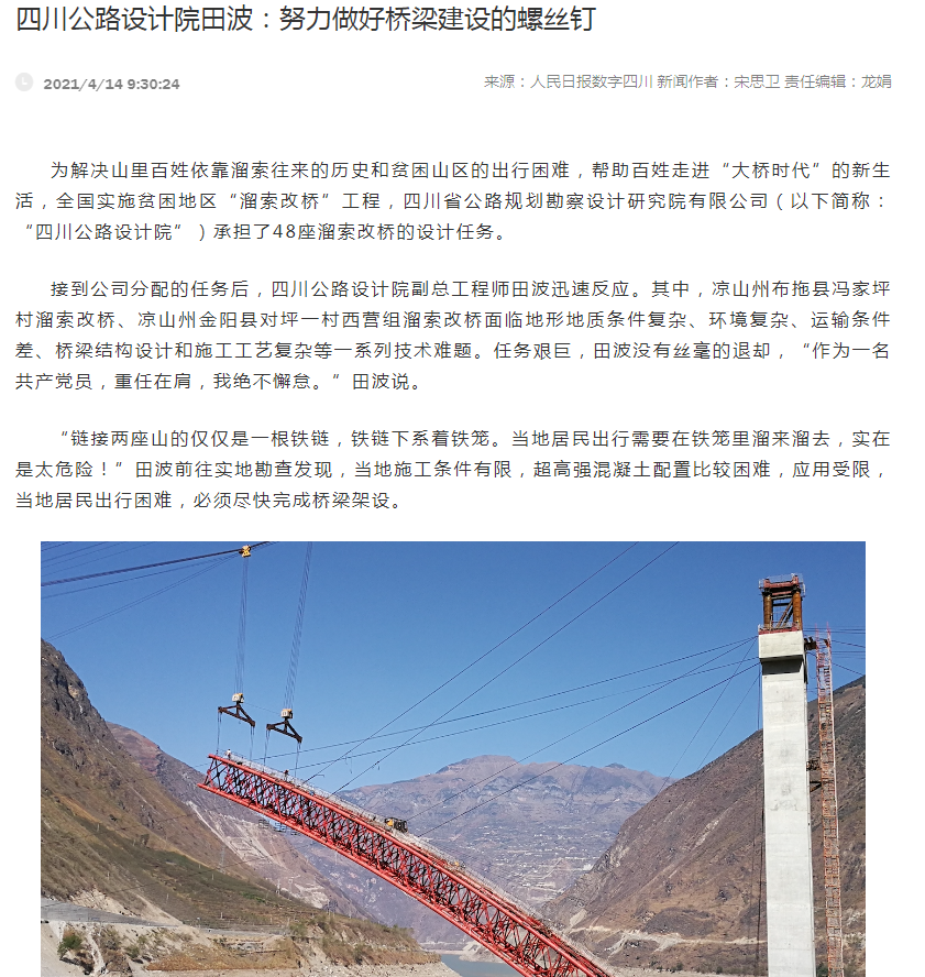 相關報道以《 四川公路設計院田波:努力做好橋梁建設的螺絲釘》為題于近日推出。報道中,田波副總工程師結合黨員的初心使命,重點講述了公司承擔的涼山州金陽縣對坪、布拖縣馮家坪等溜索改橋和宜賓南溪長江大橋、雞鳴三省大橋等渡改橋民生工程的設計故事,展現(xiàn)了優(yōu)秀共產(chǎn)黨員的精神風貌和公司勇?lián)鐣熑蔚牧己眯蜗蟆?/p>