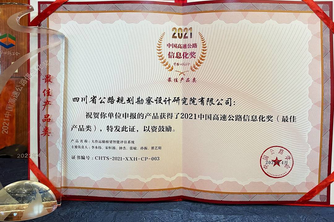 4月22日,中國(guó)公路學(xué)會(huì)第二十三屆中國(guó)高速公路信息化大會(huì)在蘇州召開,會(huì)上頒發(fā)了“2021中國(guó)高速公路信息化獎(jiǎng)”。四川省公路規(guī)劃勘察設(shè)計(jì)研究院有限公司(簡(jiǎn)稱四川公路設(shè)計(jì)院)大件運(yùn)輸技術(shù)團(tuán)隊(duì)研發(fā)的“大件運(yùn)輸橋梁智能評(píng)估系統(tǒng)”獲“2021中國(guó)高速公路信息化獎(jiǎng)——最佳產(chǎn)品類”,這標(biāo)志著四川交通大件運(yùn)輸保障水平走在全國(guó)前列。