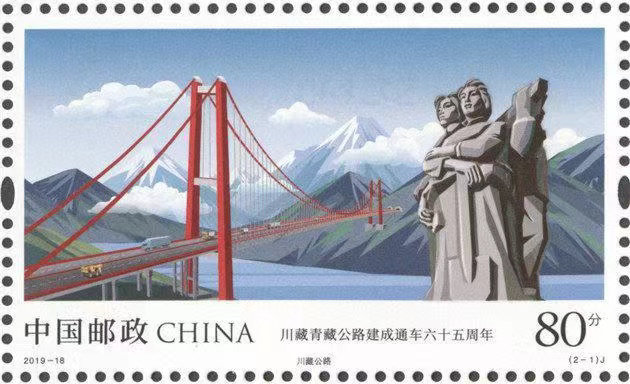 第三枚郵票和川藏高速公路有關(guān)。2018年底,雅康高速公路全線建成通車,這是第一條由四川盆地向青藏高原爬升的高速公路,被業(yè)內(nèi)譽為“攀登公路建造史的珠穆朗瑪峰”,瀘定大渡河大橋是全線代表性工程之一,有“川藏第一橋”之稱。大橋主跨1100米,是一座建造在高海拔、高地震烈度區(qū)、復(fù)雜風(fēng)場環(huán)境下的鋼桁梁懸索橋。2019年,《川藏青藏公路建成通車六十五周年》紀念郵票發(fā)行,該橋被選中,作為其中一枚的圖案。郵票上,通體紅色的大橋旁,是面帶堅毅的養(yǎng)護工人雕塑。