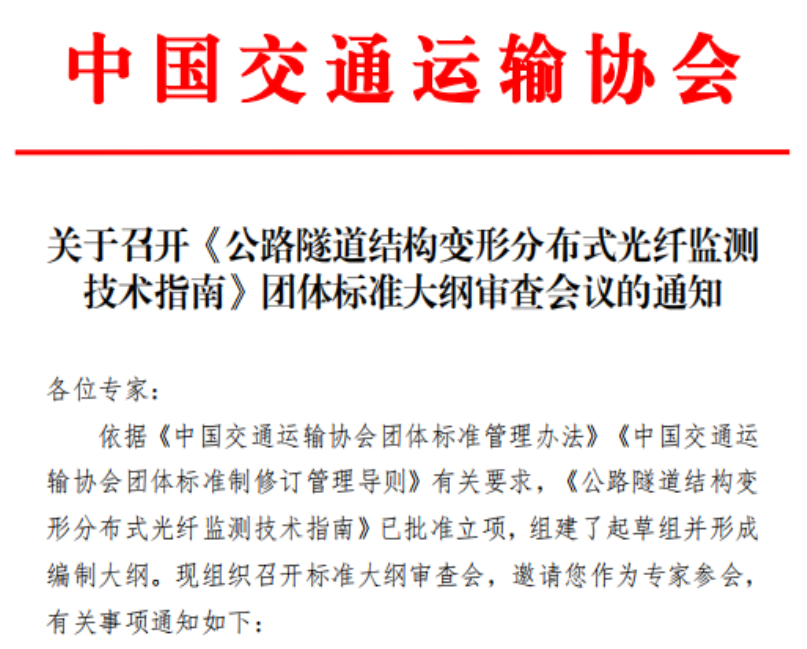 2024年8月23日,中國交通運輸協(xié)會標(biāo)準(zhǔn)化技術(shù)委員會組織召開了《公路隧道結(jié)構(gòu)變形分布式光纖監(jiān)測傳感技術(shù)指南》大綱評審會。該指南由我司主編,蘇州南智傳感科技有限公司和四川省交通建設(shè)集團有限責(zé)任公司共同參編,旨在規(guī)范分布式光纖傳感技術(shù)在公路隧道結(jié)構(gòu)變形監(jiān)測中的應(yīng)用,對運營期公路隧道拱頂開裂掉塊、局部變形坍塌等結(jié)構(gòu)風(fēng)險的長距離、大范圍感測應(yīng)用場景具有重要推廣作用。
