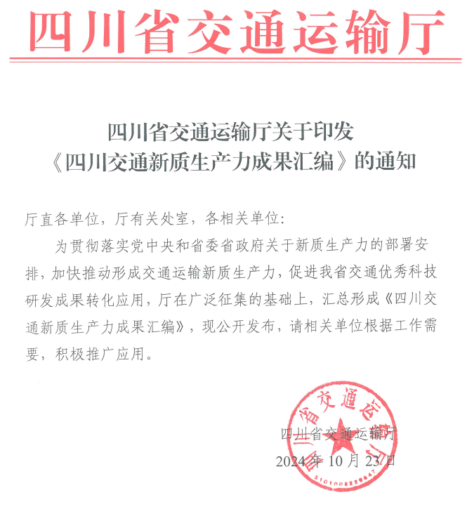 近日,四川省交通運輸廳印發(fā)了《四川交通新質生產(chǎn)力成果匯編》的文件通知,我司研創(chuàng)的“公路工程三維數(shù)字化協(xié)同設計系統(tǒng)”“基于數(shù)字化檢測與結構智能監(jiān)測數(shù)據(jù)融合的橋梁結構風險狀態(tài)預警與綜合評定技術”“基于分布式變形監(jiān)測的隧道拱頂開裂掉塊預警技術”“土木結構工程高性能部品”“可清潔可更新的耐久性新型雙層地下排水管”“高性能水泥混凝土及高性能灌漿材料”等6項技術成果成功入選。