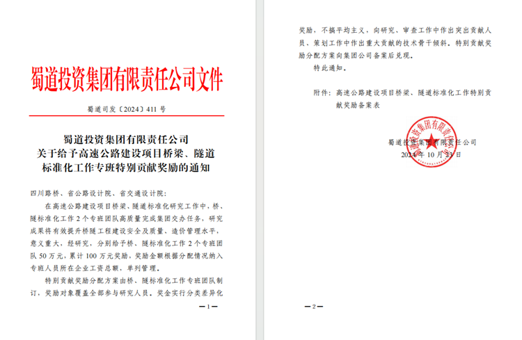 近日,蜀道集團發(fā)布了《關(guān)于給予高速公路建設(shè)項目橋梁、隧道標(biāo)準(zhǔn)化工作專班特別貢獻獎勵的通知》(蜀道司發(fā)[2024]411號)文件,我司牽頭的“高速公路建設(shè)項目橋梁標(biāo)準(zhǔn)化研究”和參與的“高速公路建設(shè)項目隧道標(biāo)準(zhǔn)化研究”2個專班團隊高質(zhì)量完成集團交辦任務(wù),研究成果有效提升了橋隧工程建設(shè)安全及質(zhì)量、造價管理水平,意義重大。經(jīng)研究,分別給予橋、隧標(biāo)準(zhǔn)化工作2個專班團隊特別貢獻獎。