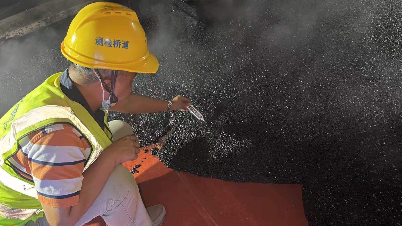 施工期間,道橋試驗研究所技術(shù)服務(wù)團隊主要開展了以下工作:對瀝青、骨料、礦粉等原材料質(zhì)量進行嚴格抽檢,確保材料符合設(shè)計要求;在混合料生產(chǎn)過程中,全程監(jiān)控拌和溫度、油石比、級配等關(guān)鍵參數(shù),確保每一盤出場的澆注式瀝青混合料性能穩(wěn)定達標(biāo);對運輸過程保溫、現(xiàn)場攤鋪溫度、厚度控制以及攤鋪工藝進行實時動態(tài)監(jiān)測與指導(dǎo),確保施工各環(huán)節(jié)無縫銜接、精準(zhǔn)可控;通過現(xiàn)場試驗檢測混合料流動性等參數(shù),及時獲取試驗數(shù)據(jù),為施工決策提供即時、科學(xué)的依據(jù),及時糾偏,防患于未然。