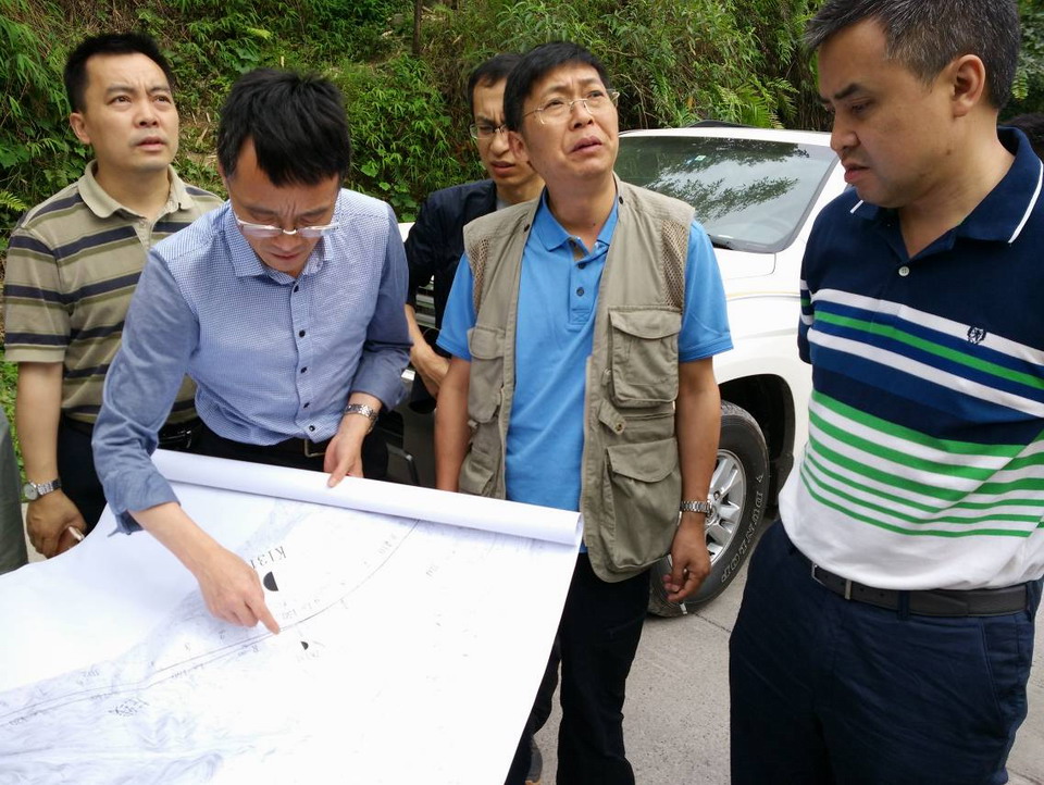 檢查組實地踏勘了互通、岷江特大橋、五指山隧道、不良地質(zhì)地段等二十余處重要工點,聽取了四分院的技術(shù)方案匯報,并在現(xiàn)場討論互通方案、隧道軸線、不良地質(zhì)繞避等復(fù)雜技術(shù)問題。檢查組到測設(shè)隊駐地分專業(yè)檢查了勘測資料的收集情況,并與全體技術(shù)人員座談交流,強調(diào)了本項目的特點及勘測過程中需要注意的事項,審定了前30km(K83~K113)的技術(shù)方案。