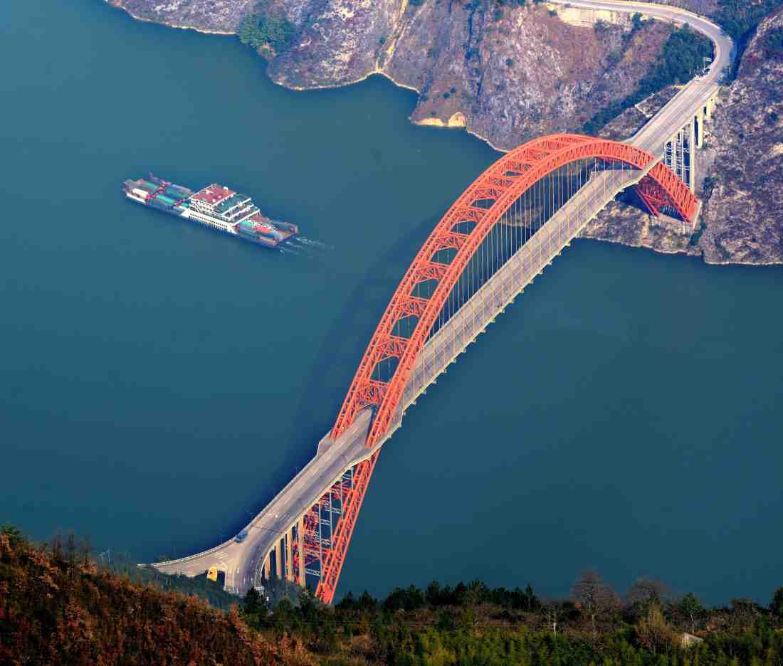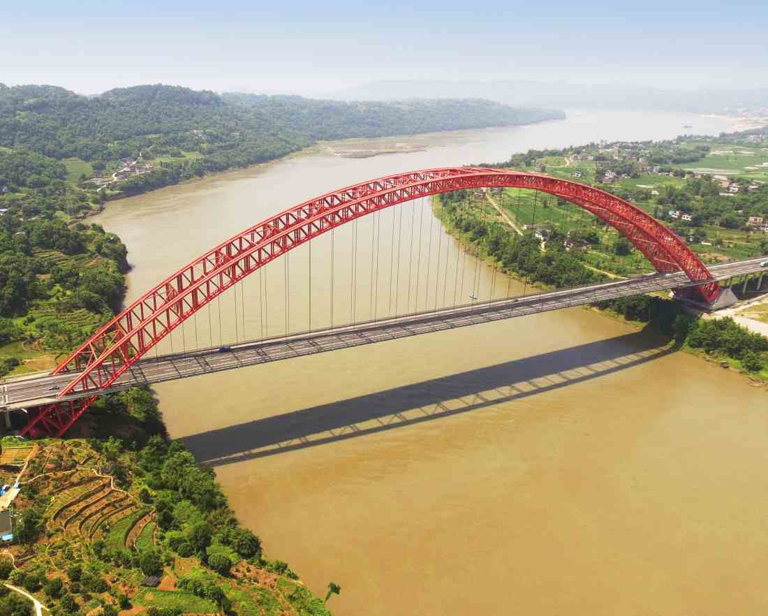 為瀘渝高速公路跨長江的特大型鋼管混凝土桁架拱橋,主孔凈跨徑500米,為目前同類型橋梁世界第一